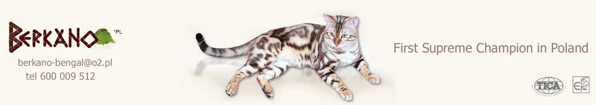W moim domu wychowałam Majkę i dwa mioty bengali. Widzę jak rozwijają się maluszki i jak wyraźne robią się ich cętki, gdy dorastają. Moje obie matki (Brzoza i Majka) rodzą dzieci o wyraźnych cętkach na jasnym tle, o wiele ładniejsze od nich samych. Widząc to i wiedząc, że bengale osiągają pełną gamę kolorów ok. 1,5 roku życia a potem już tylko ciemnieją postanowiłam, rozwinąć hodowlę w kierunku jak największego kontrastu między tłem a wzorem na futrze i dlatego w lipcu tego roku przyleciał do mnie QUERO. Udało mi się zarejestrować kota z własnym przydomkiem: Glitterglam QUERO of Berkano. Piękny, duży, śnieżny bengal. Quero pochodzi z wiodącej hodowli w Anglii. Jestem bardzo wdzięczna Jill Fyfe z hodowli Glitterglam, że zgodziła się mi go sprzedać. Wiem, że z tej hodowli jest jeszcze jedna dziewczynka we Francji i jeden chłopiec za wschodnią granicą.